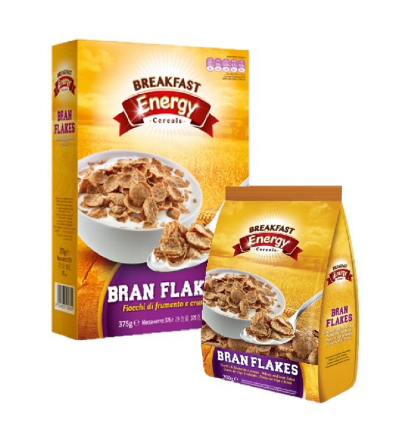 Fiocchi di cereali prodotti con farina di frumento integrale, ad alto contenuto di fibra, per una colazione sana ed equilibrata.